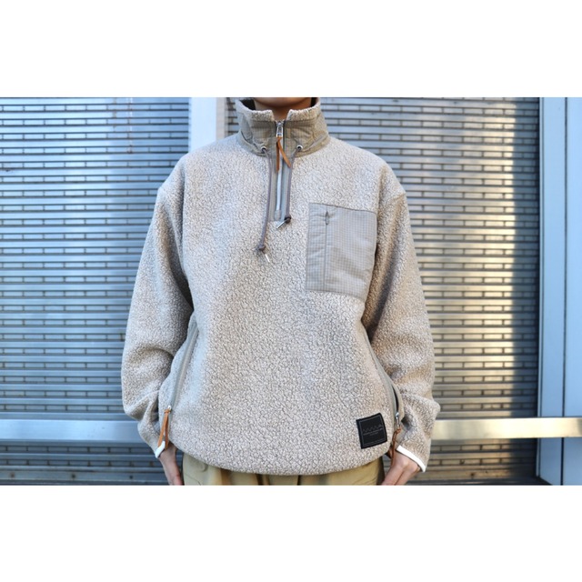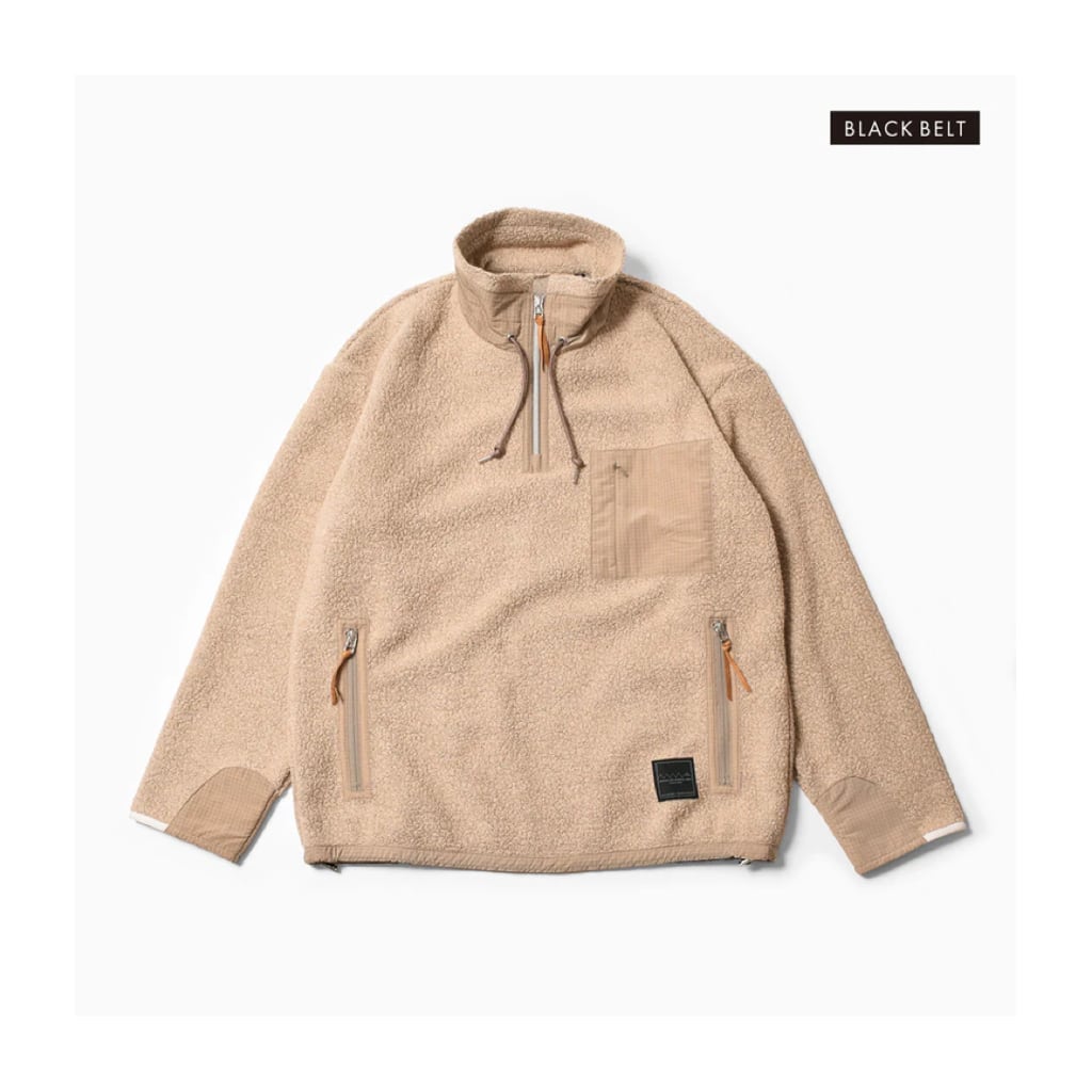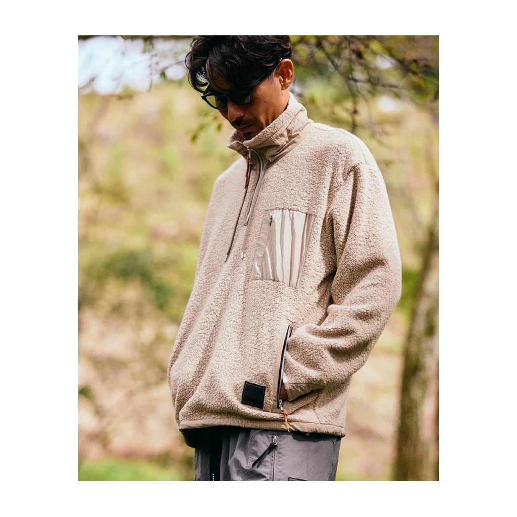日本製のオリジナルボディは、肩幅と身幅にゆとりを持たせたリラックスシルエット。胸元のハーフファスナーで体温調節が可能。ファスナーは軽量で高級感のあるメタリックコイルファスナーを使用。襟とポケットカバーと袖先には高強度の撥水モノフィラメントリップストップナイロンを使用することで高い耐久性を持つ。