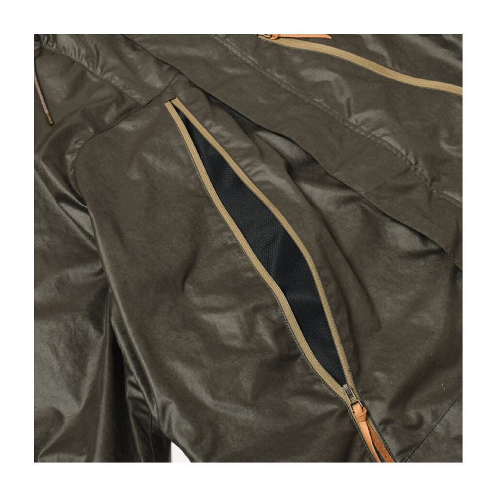 ヴィンテージ感のある光沢がワックスドコットンに見える素材は「小松マテーレ」による形状保持加工と撥水加工を施した軽量機能素材。重量感のあるビジュアルに反して軽量な着心地で、大きなベンチレーションを備えたウィンドシェル。
