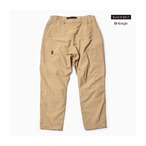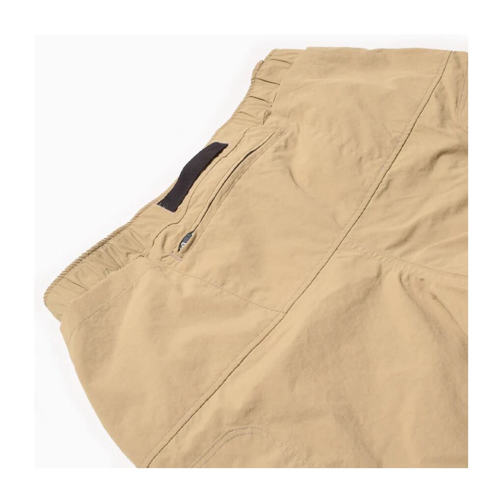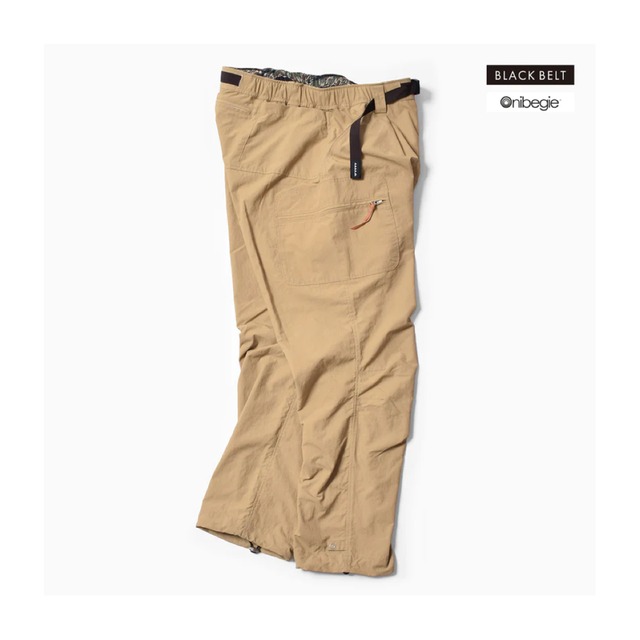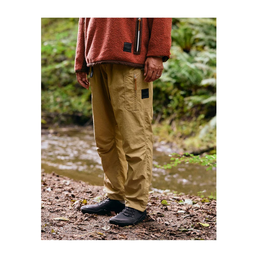 日本製のオリジナルボディは、クライミングパンツをベースにヒップとワタリに余裕を持たせ、裾に向かいテーパードするシルエット。フロントポケット、背部三連ポケット、左右アシンメトリーの脚部カーゴポケット、合計7つのポケットを備える。様々なサイズと形状のポケットは、手ブラで外出できる高い収納力を持つ。ウエストはウェビングベルト+ゴム、裾はドローコードでフィット感を調整可能。