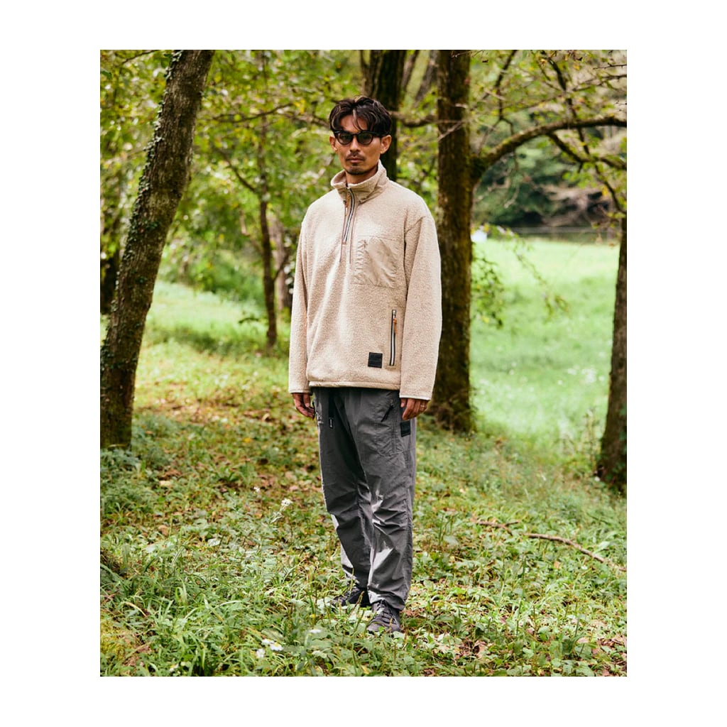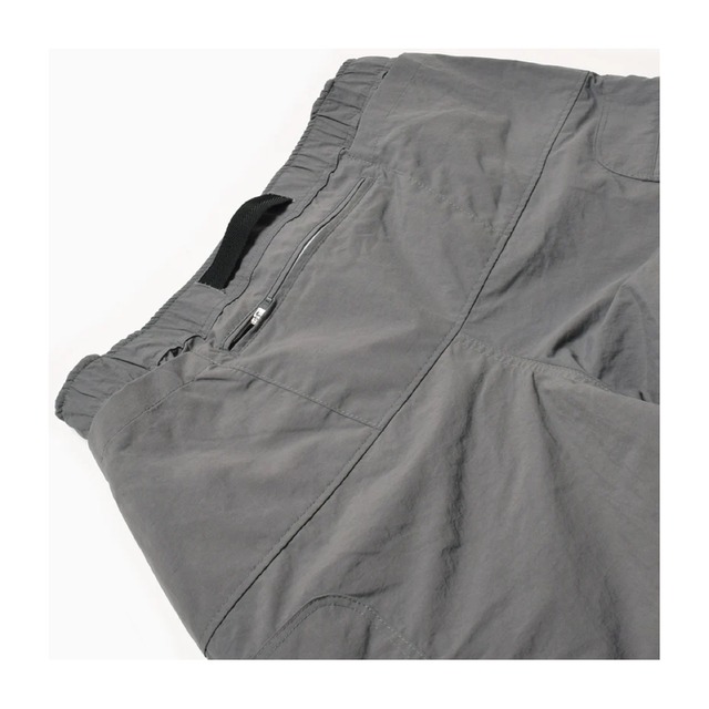 日本製のオリジナルボディは、クライミングパンツをベースにヒップとワタリに余裕を持たせ、裾に向かいテーパードするシルエット。フロントポケット、背部三連ポケット、左右アシンメトリーの脚部カーゴポケット、合計7つのポケットを備える。様々なサイズと形状のポケットは、手ブラで外出できる高い収納力を持つ。ウエストはウェビングベルト+ゴム、裾はドローコードでフィット感を調整可能。