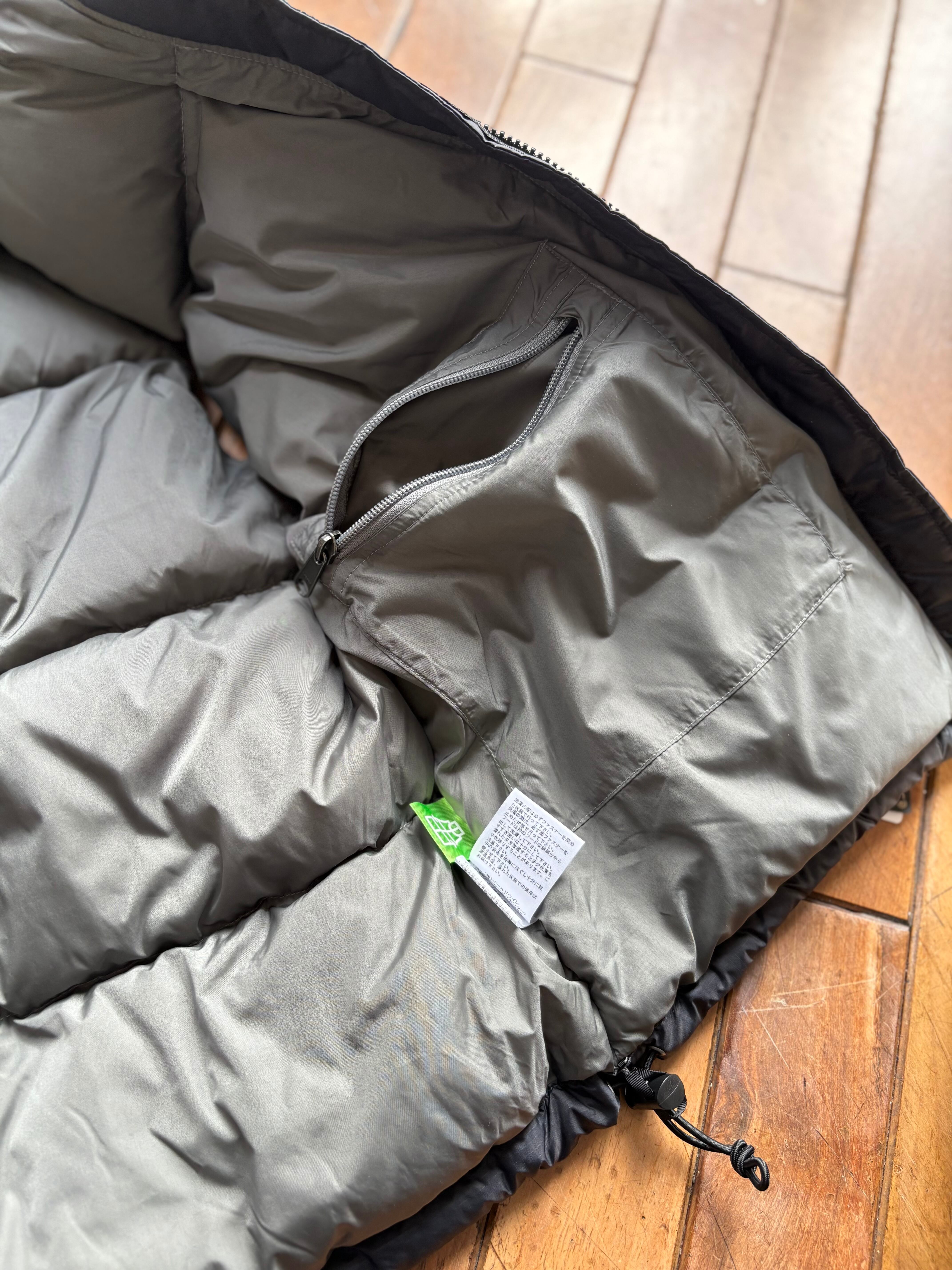 <表地>40D Recycled Nylon Ripstop(ナイロン100%)<中わた>GreenRecycled CLEANDOWN(ダウン80%、フェザー20%)<肩部分・裏地>Recycled Nylon Cloth(ナイロン100%)