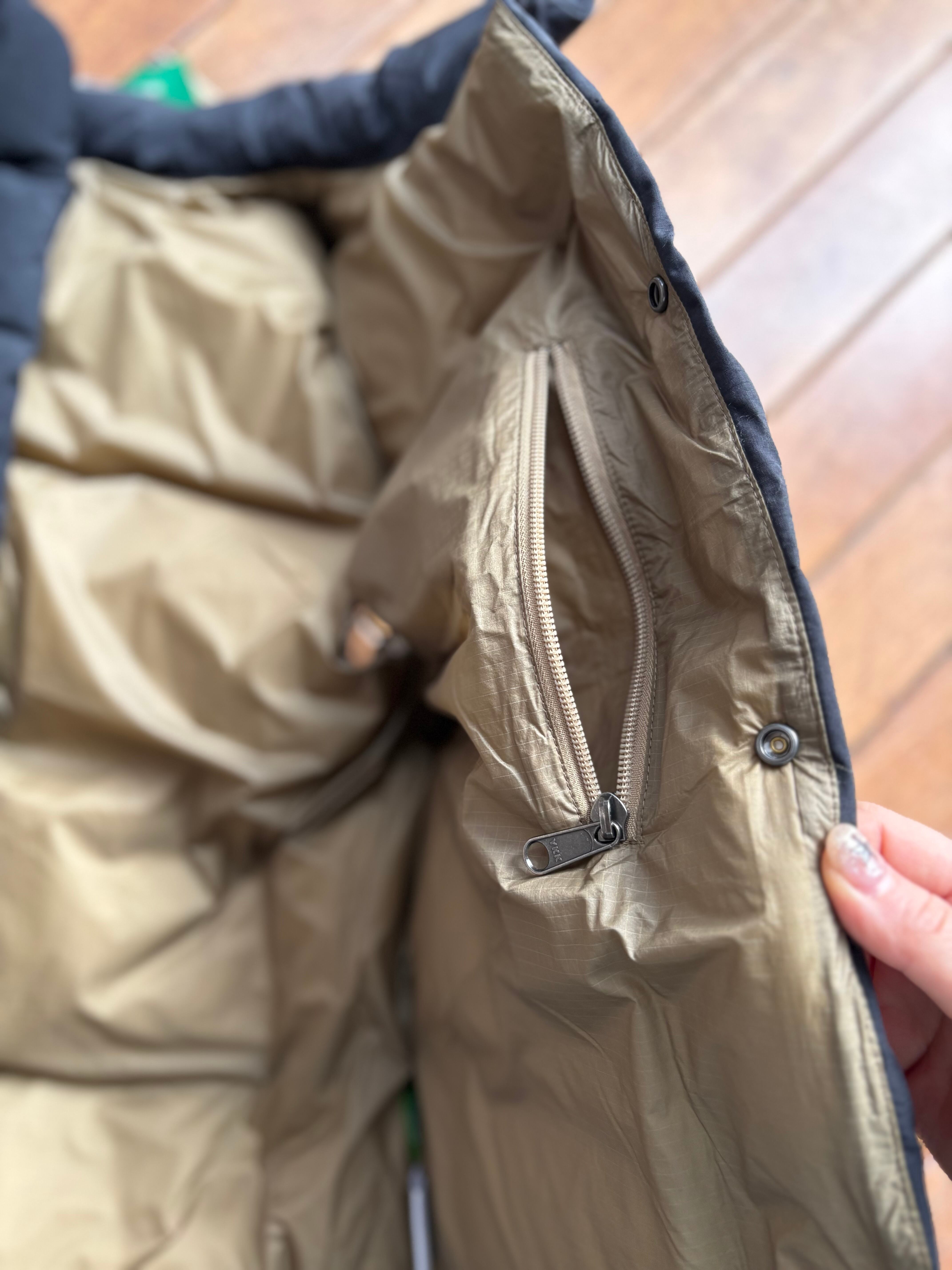 表地は、異形中空糸を使用した軽さが特徴のナイロン素材。コットンライクな自然な風合いで、はっ水性も備わっています。中わたには一部リサイクルダウンを採用し、ダウン特有のバッフル感と軽さを体感できます。裏地は、薄くすべりのよい12デニールのナイロンリップストップ。