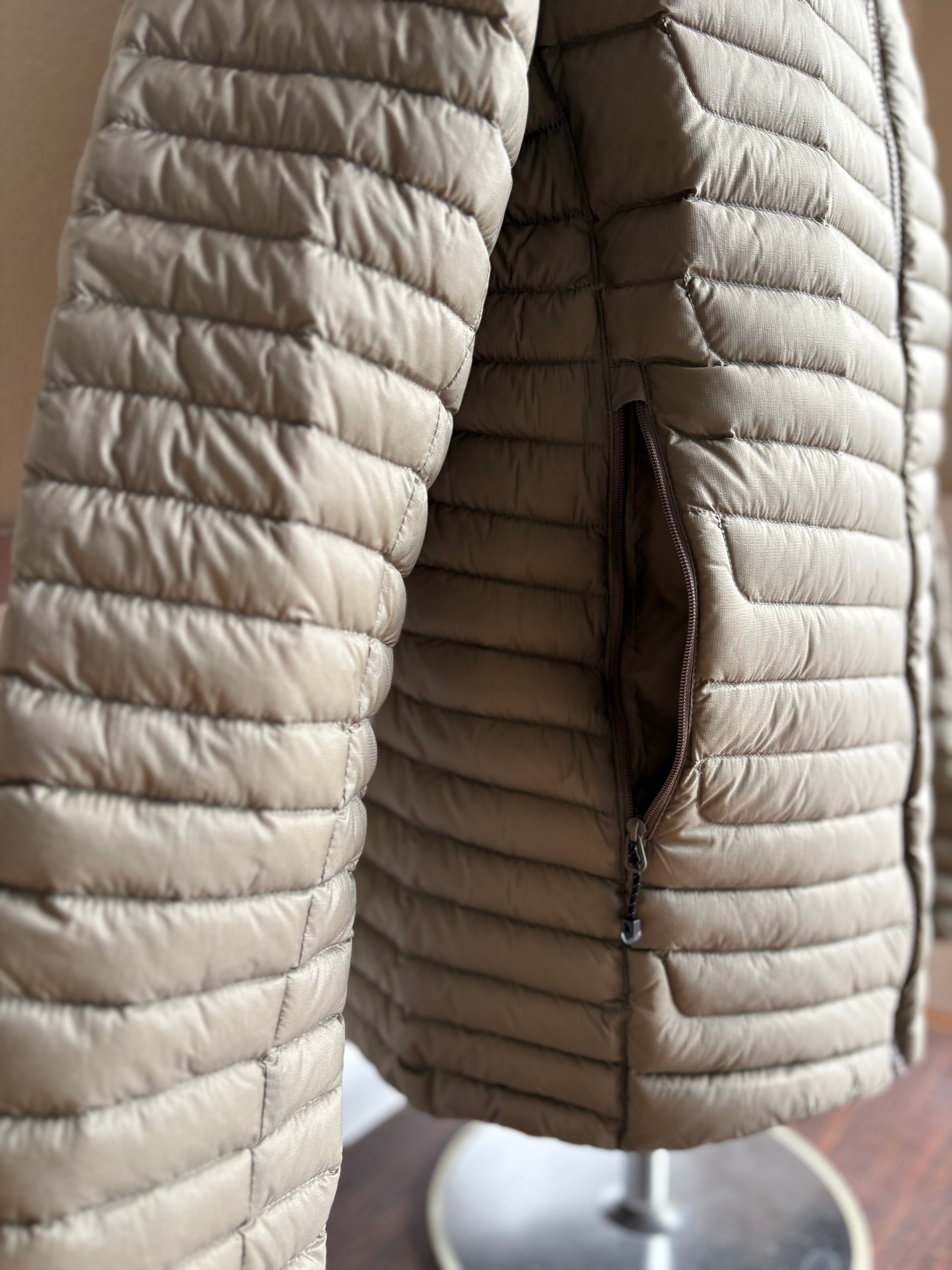 身頃には、高度な洗浄技術により汚れを徹底的に除去し、さらにはっ水加工を施したクリーンなダウンを使用。パックでつぶれやすい肩部分には板状の化繊わたを配置。生地にはソフトな肌触りで軽く、強度も兼ね備えるパーテックスカンタムを使用。専用ファスナーでアウターシェルと連結できる、ZIP IN ZIPシステム対応。 本体を左胸内ポケットに収納できるポケッタブル仕様です。